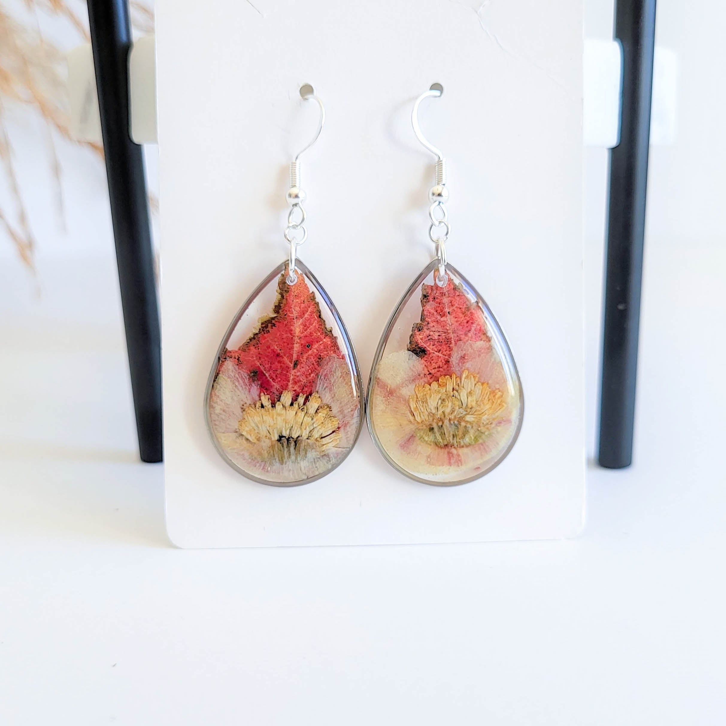 Autumn real flower earrings. The earrings feature real pressed leaves and yellow marigolds that capture the colors of fall. The flowers are pressed and preserved in jeweler’s grade resin. The shape of the earrings is teardrop, measuring approximately .86″ x 1.25″ (22mm x 32mm) Silver plated fish wire hooks.