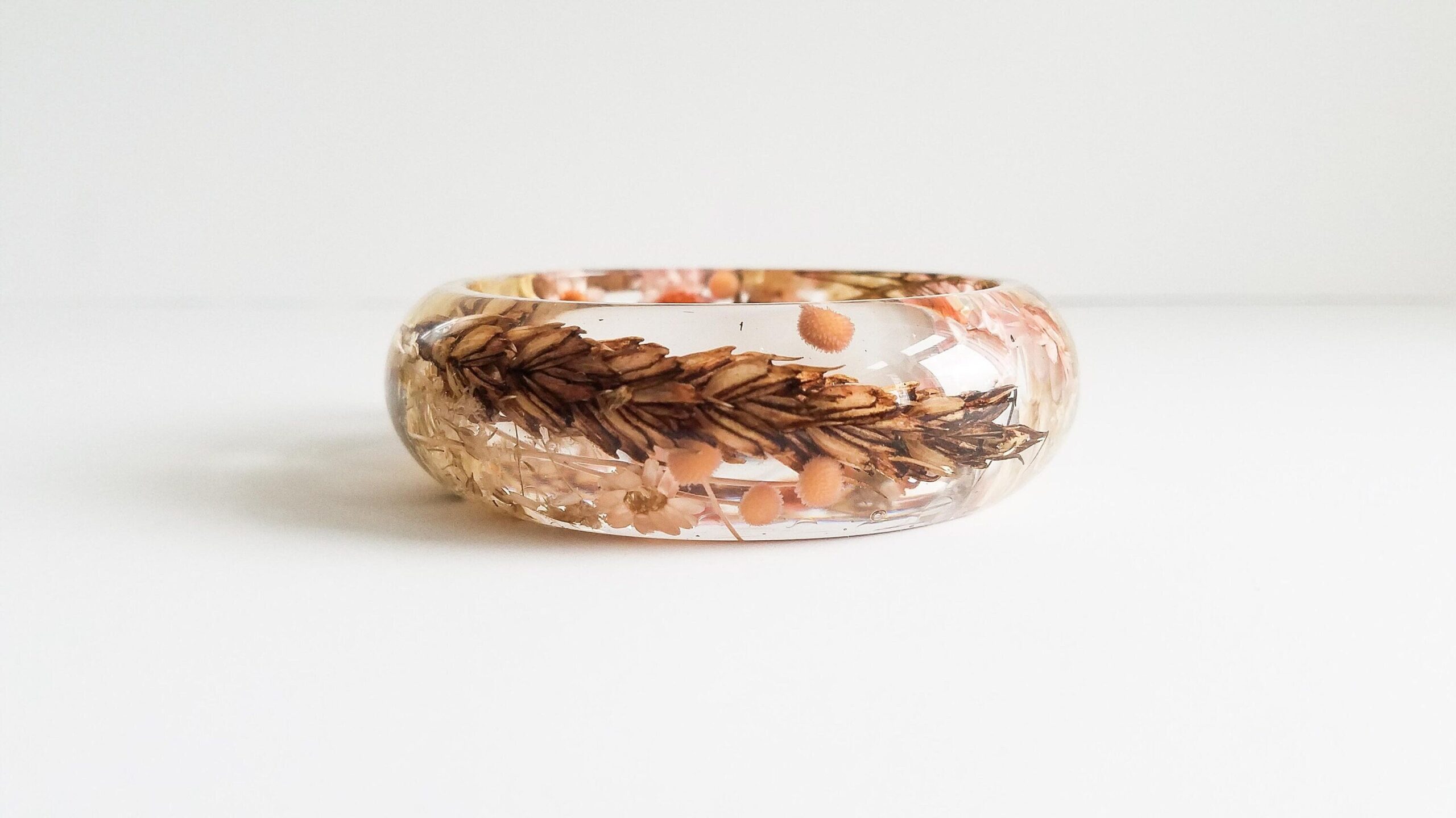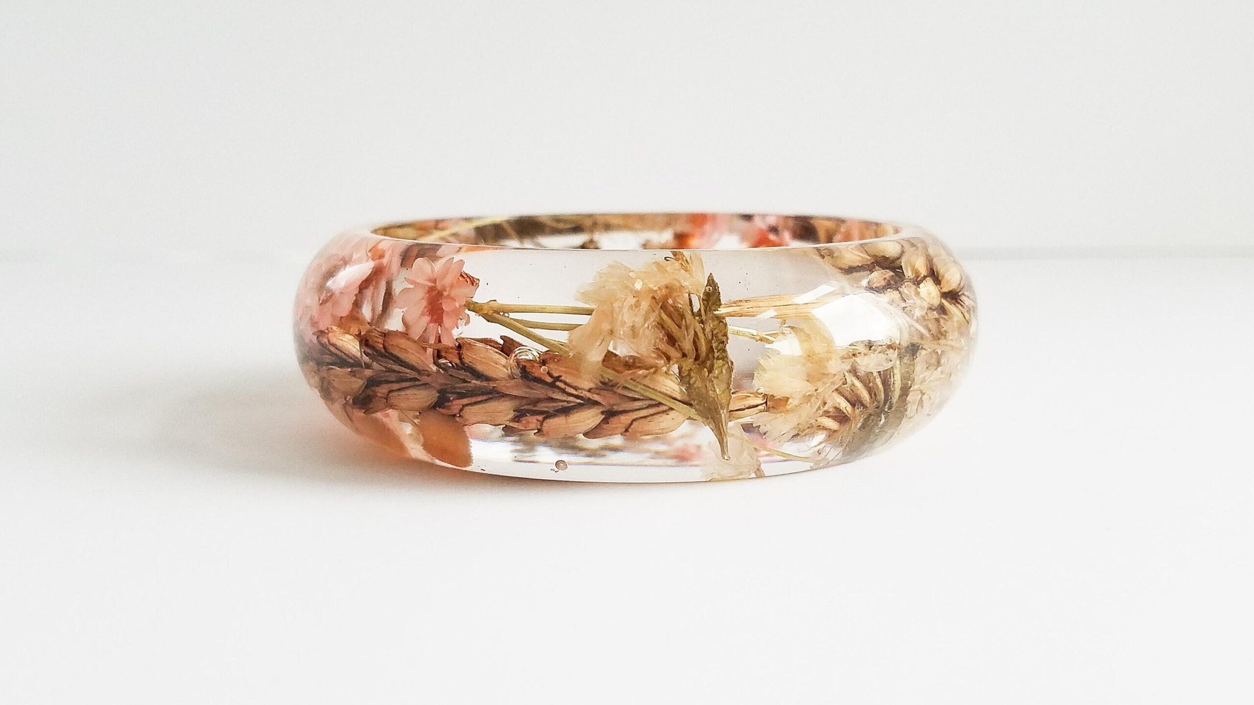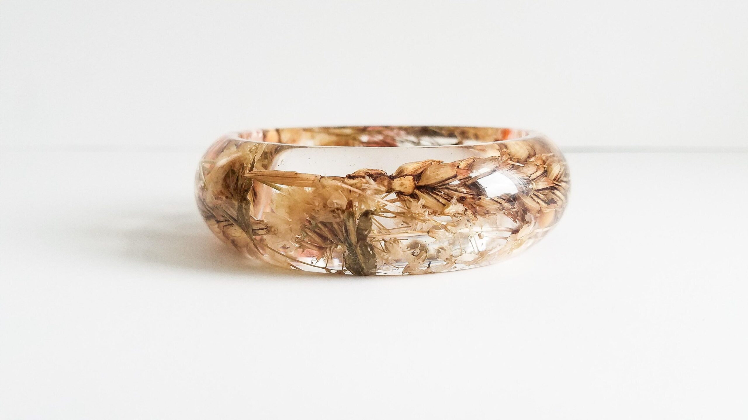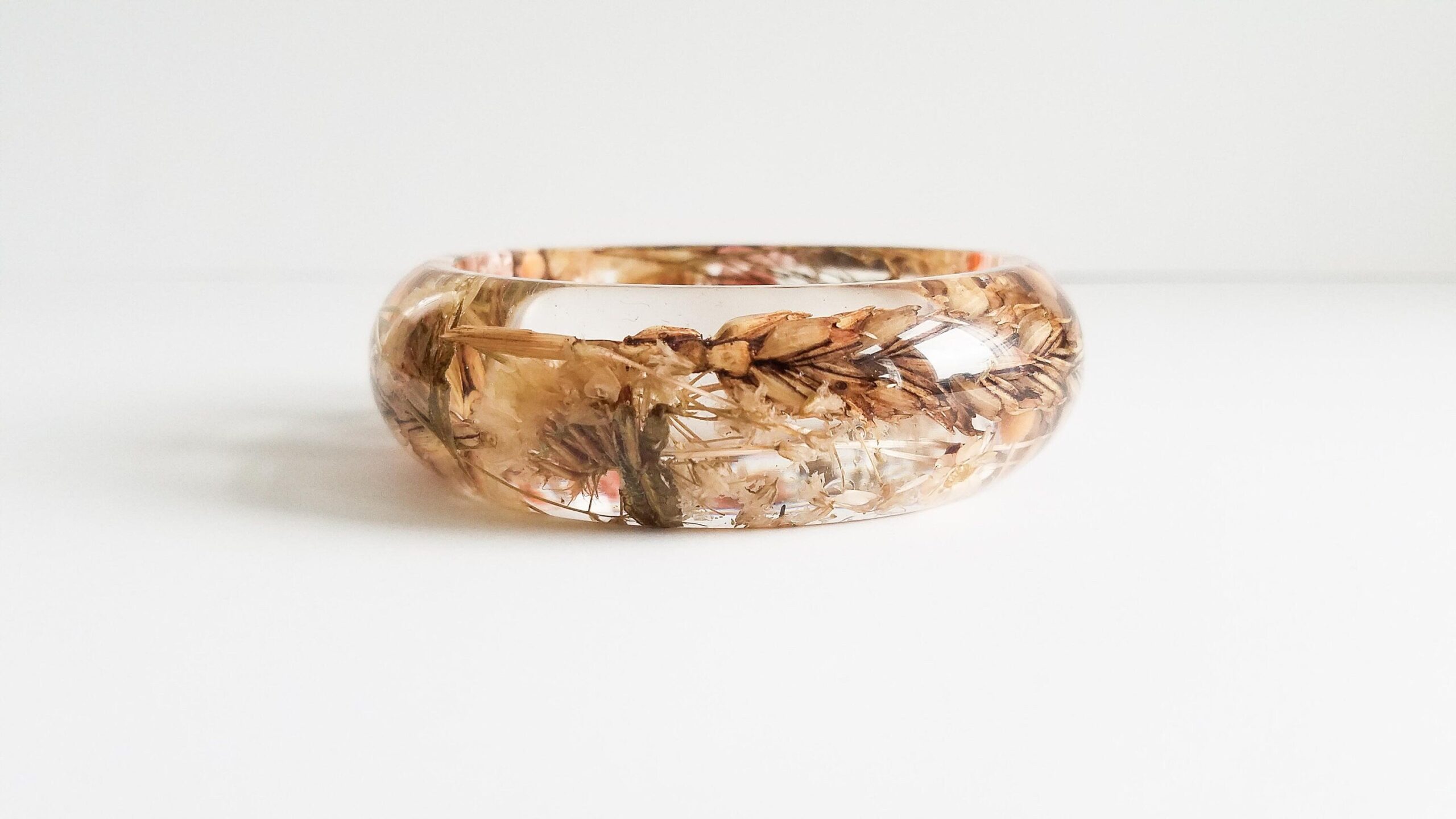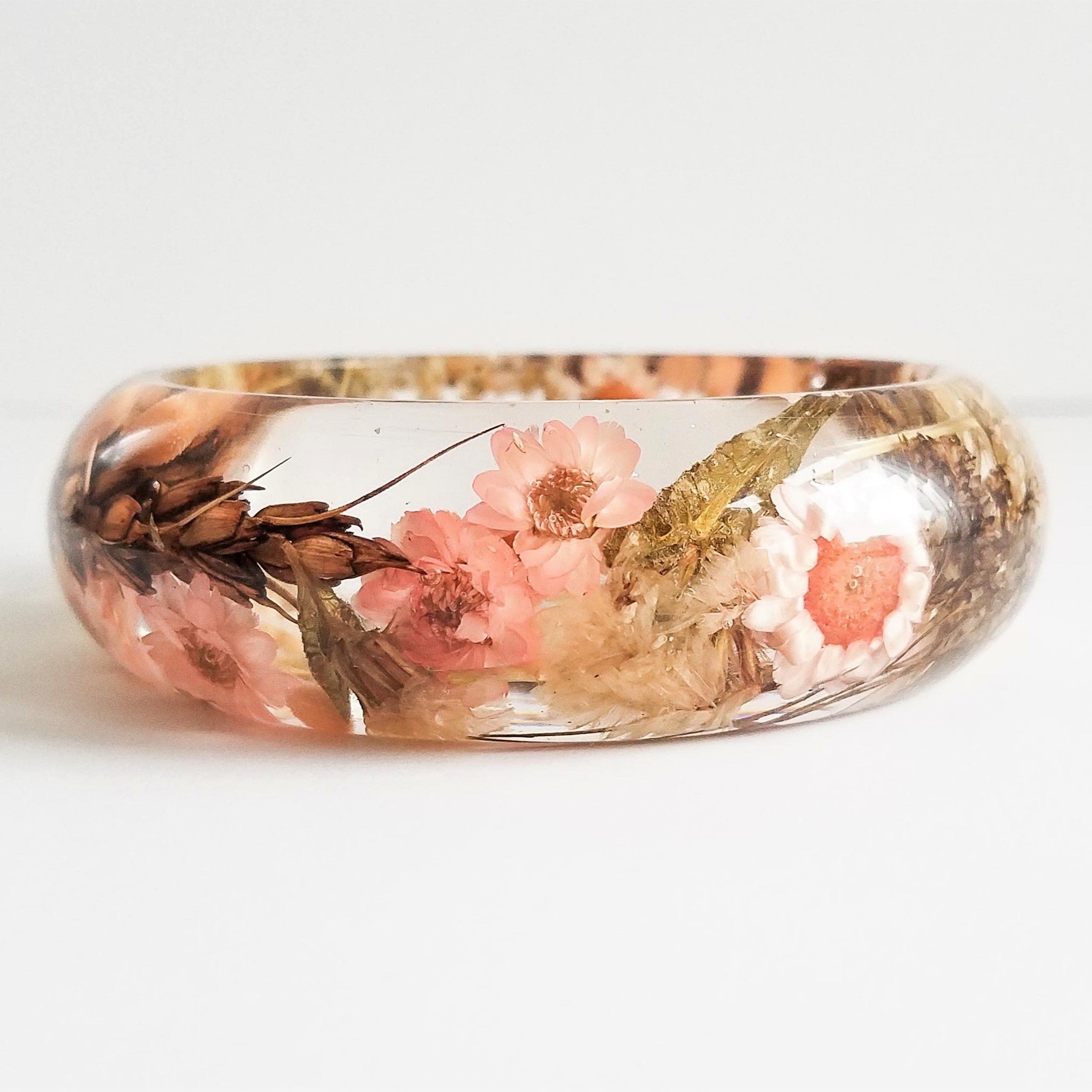 Real flower resin bracelet. Makes a unique gift for her. The bracelet features real wheat, light pink star flowers, statice and baby’s breath. The bracelet is made with jeweler’s grade resin.