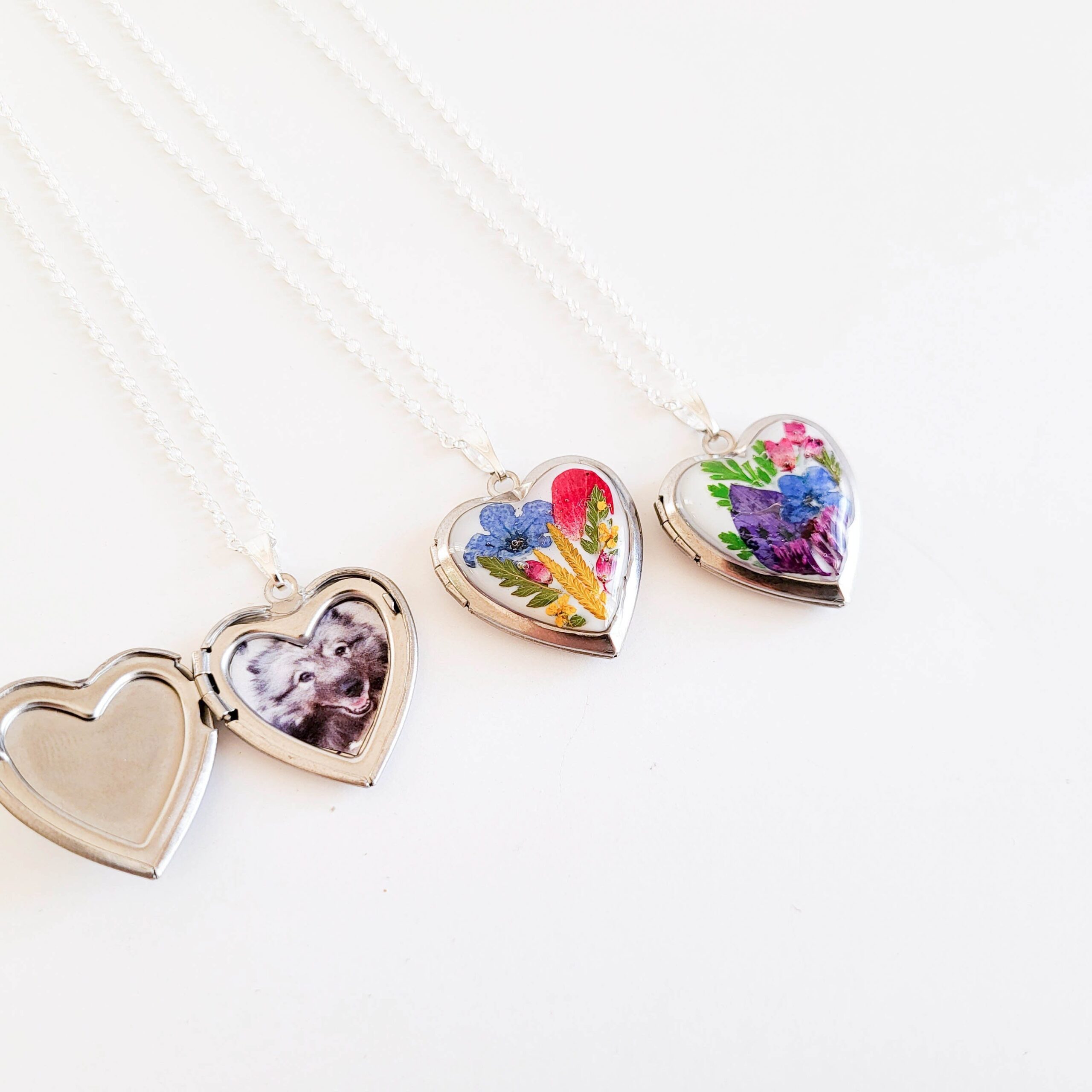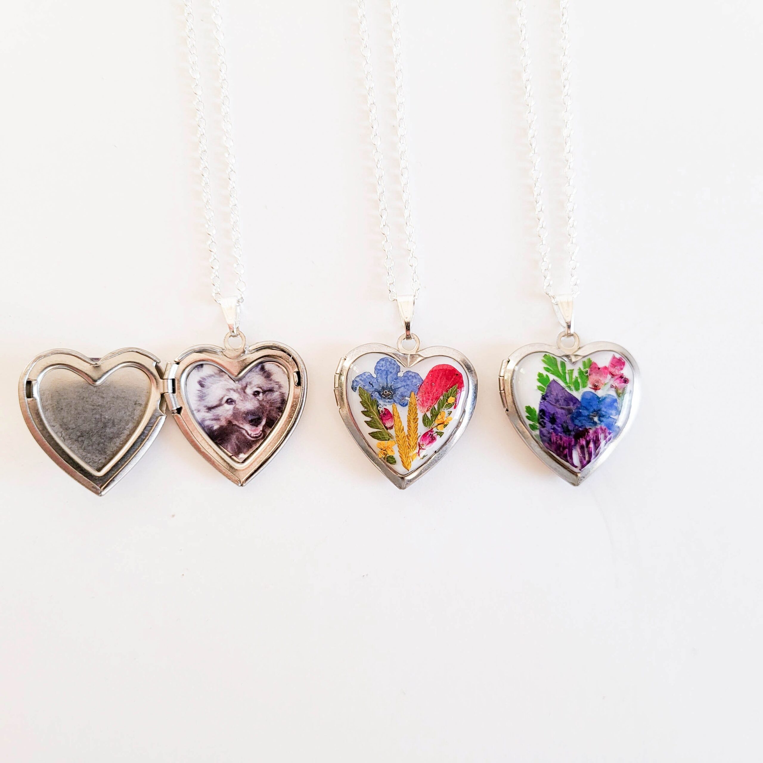 Heart locket necklace with real pressed flowers. Two design options are available to choose from. Both designs feature a blue forget me not flower.