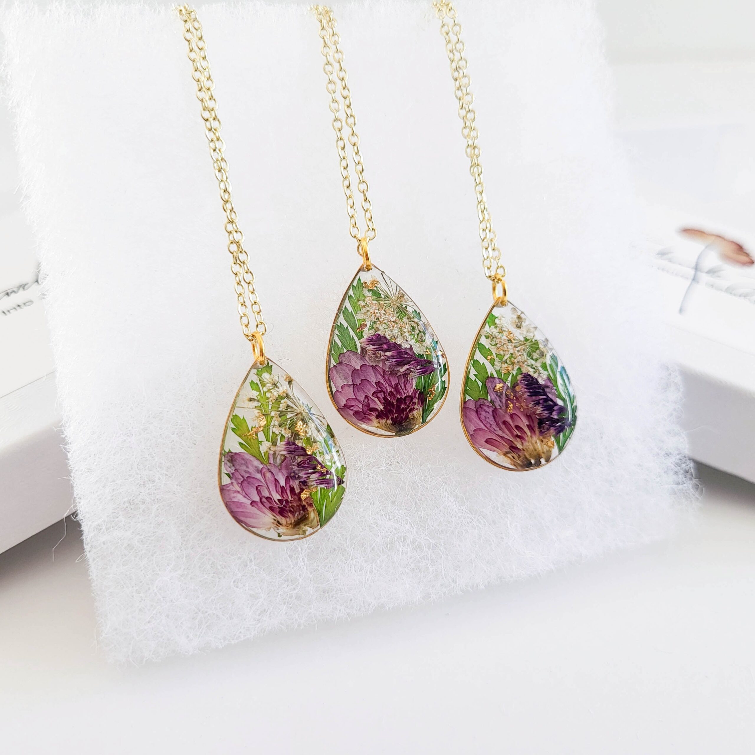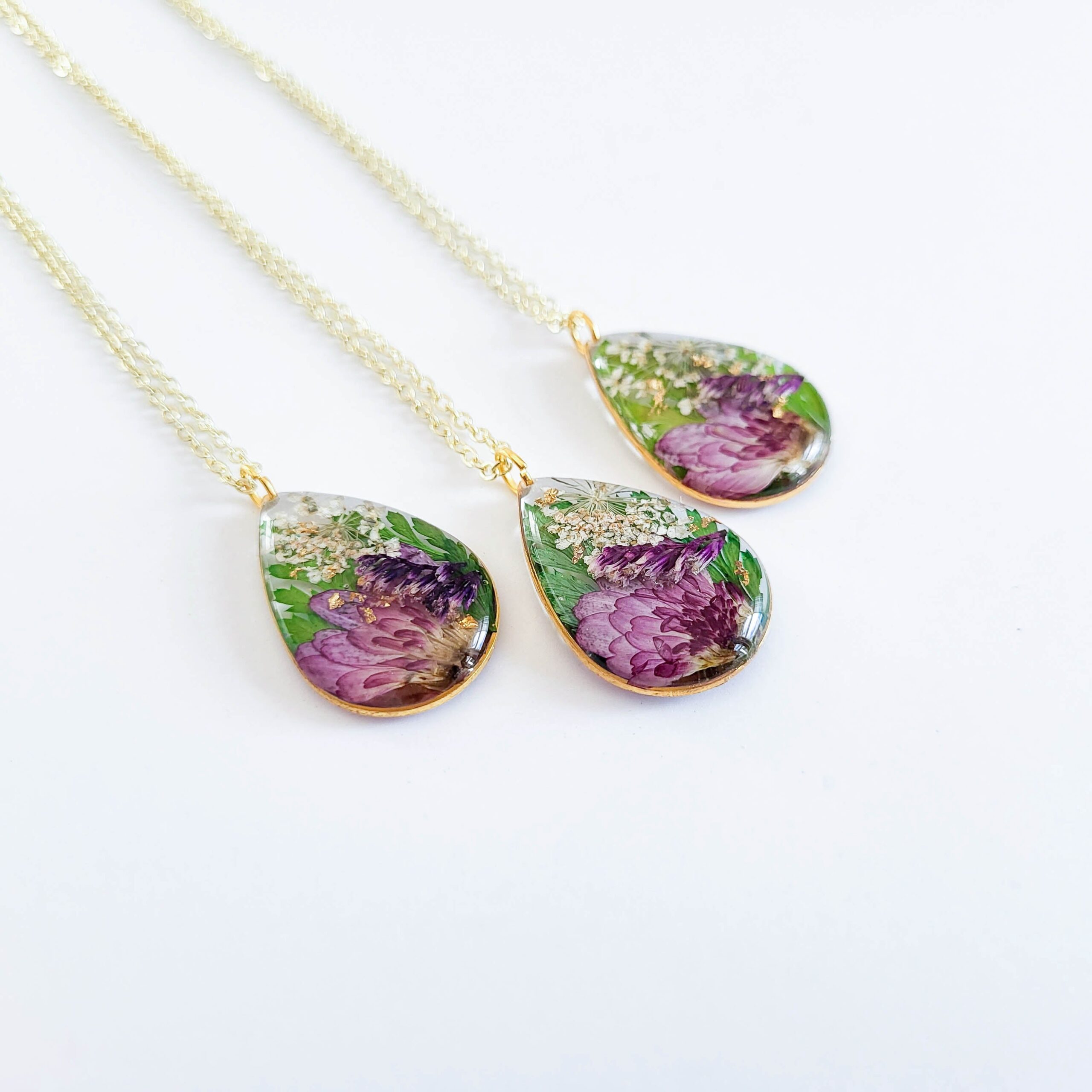 The necklace features Chrysanthemum and accent flowers, and gold leafing accents. Available in 18 “gold/silver plated chain. Longer chains lengths available upon request.
