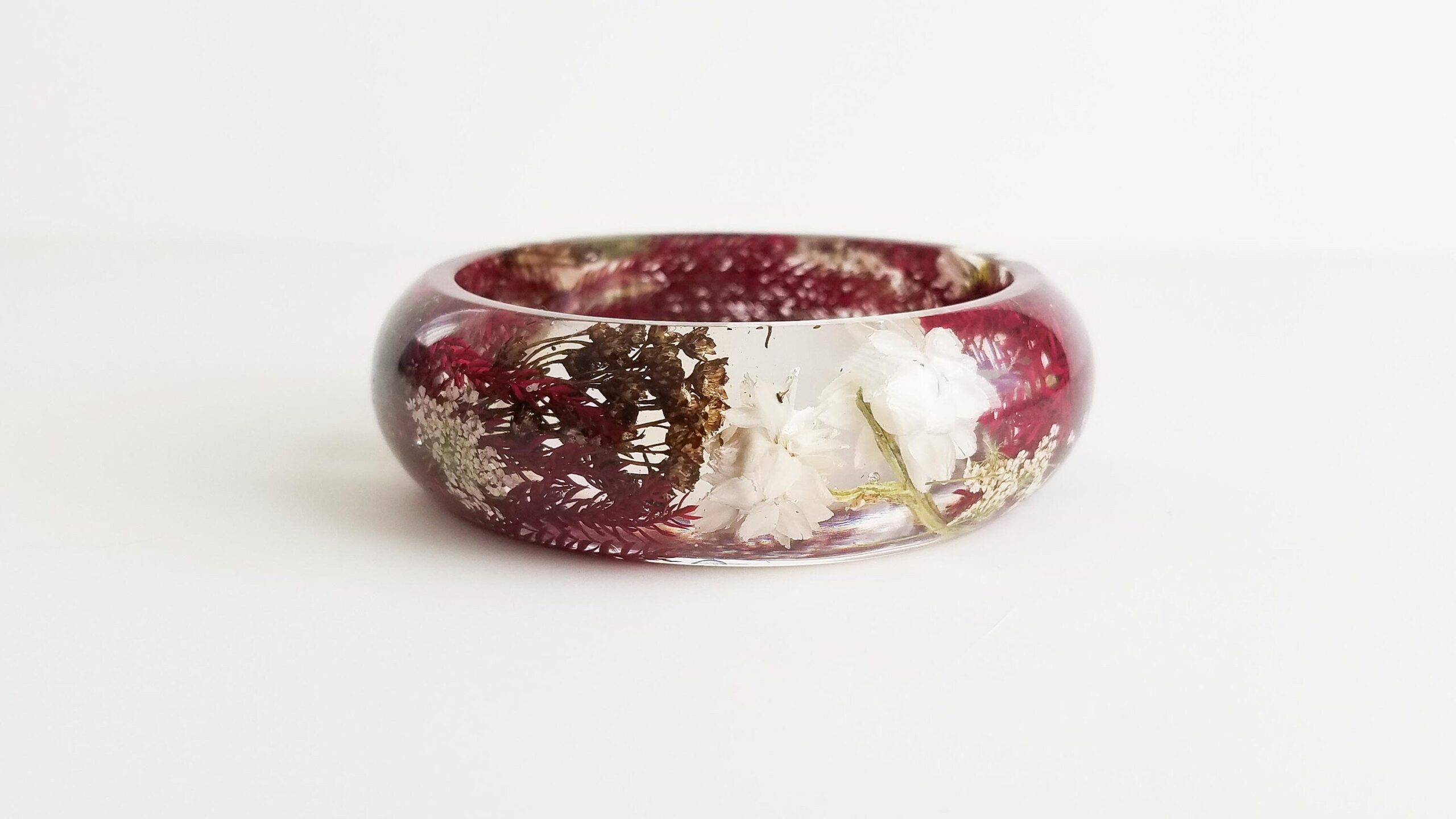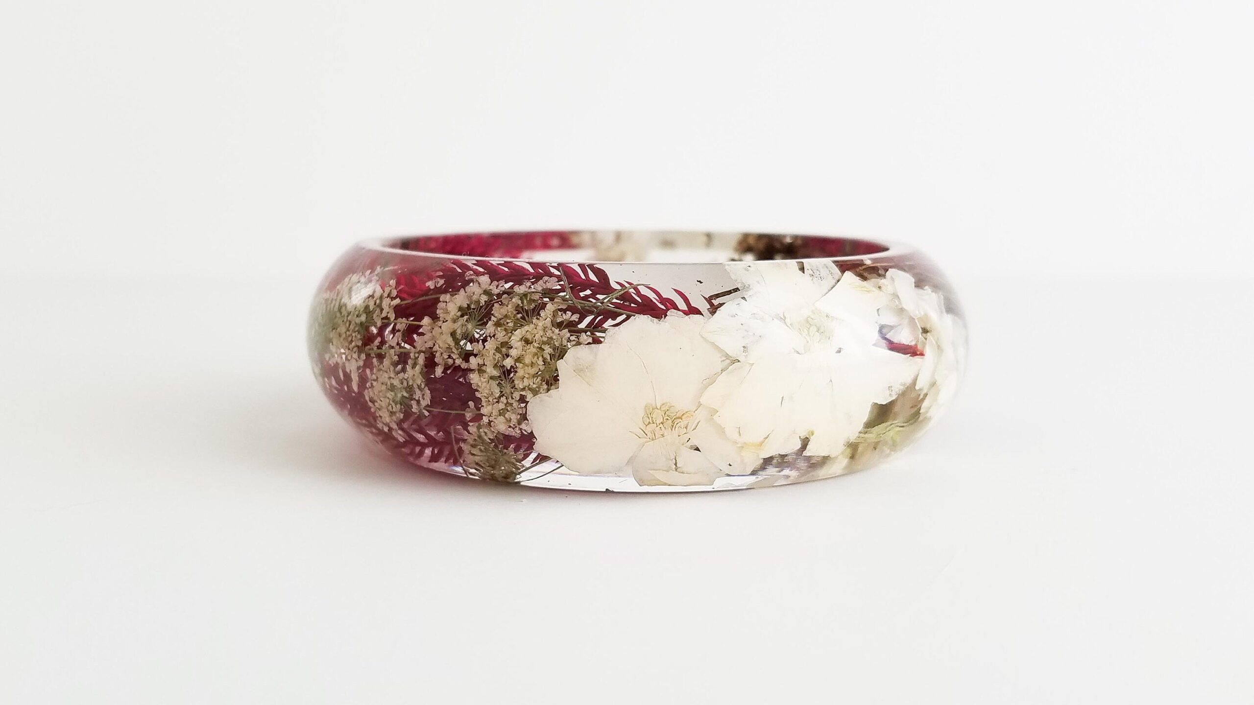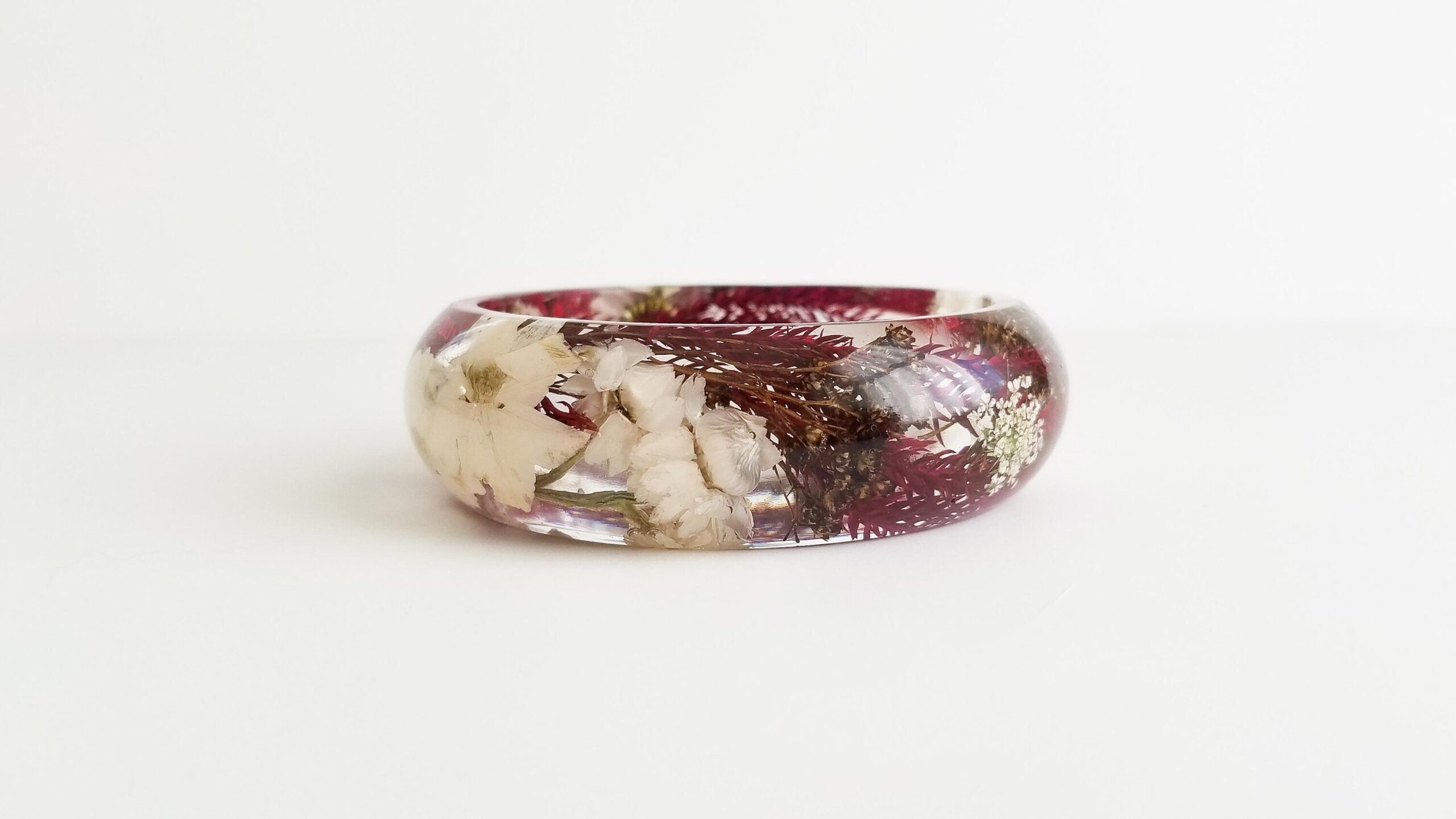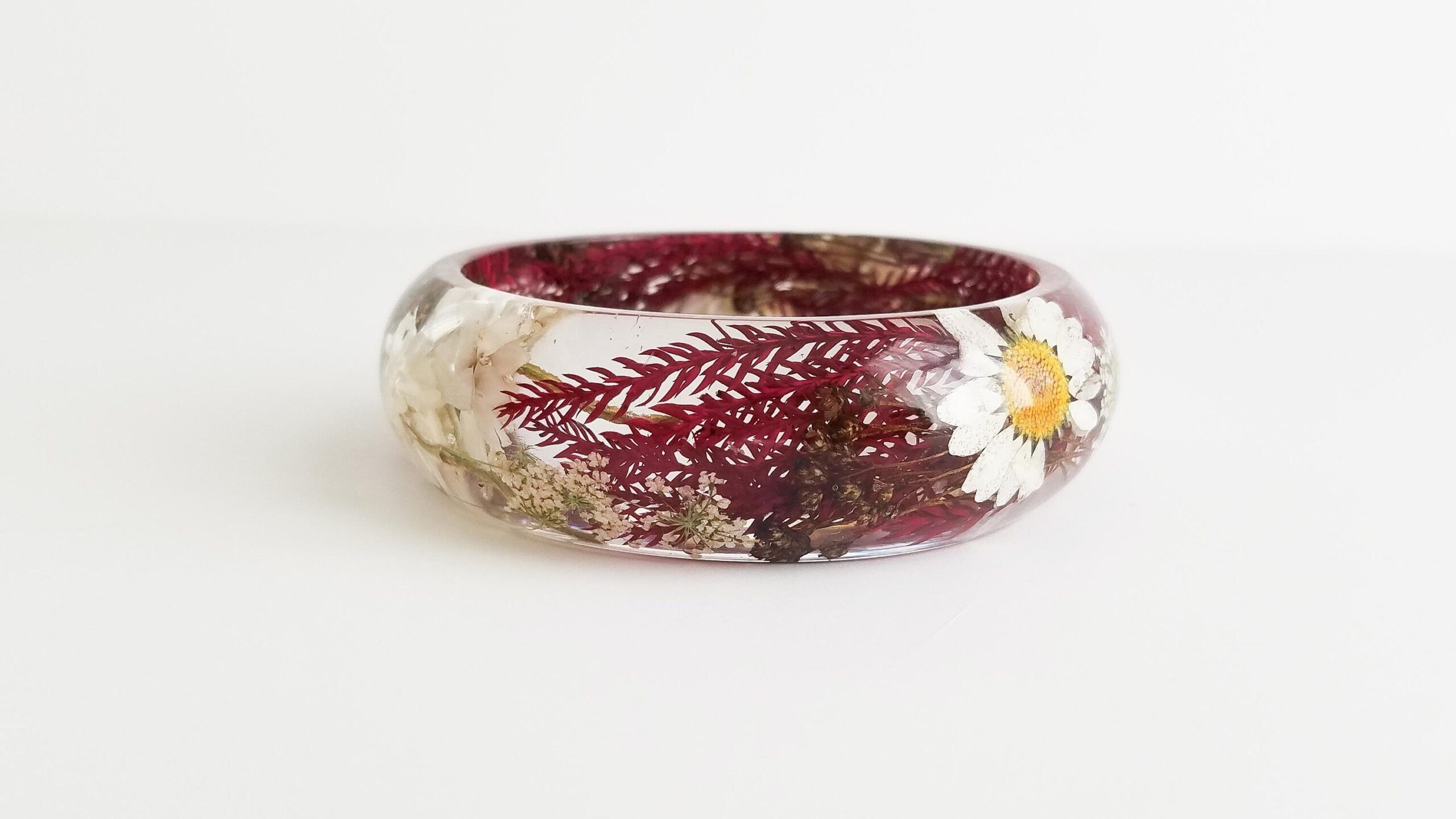 Real flower resin bracelet. The bracelet features red pine, daises, larkspur and Queen Anne’s flowers. The bracelet is made with jeweler’s grade resin.