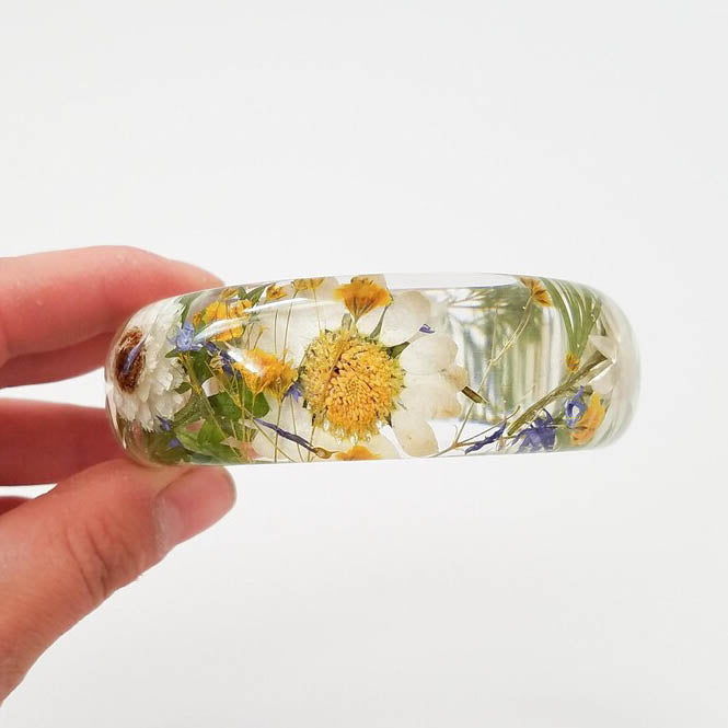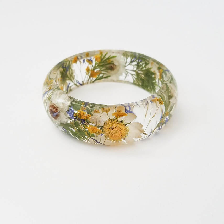 Real flower resin bracelet. The bracelet features real pressed Daises, ferns, cornflowers and yellow baby’s breath flowers. The bracelet is made with jeweler’s grade resin.