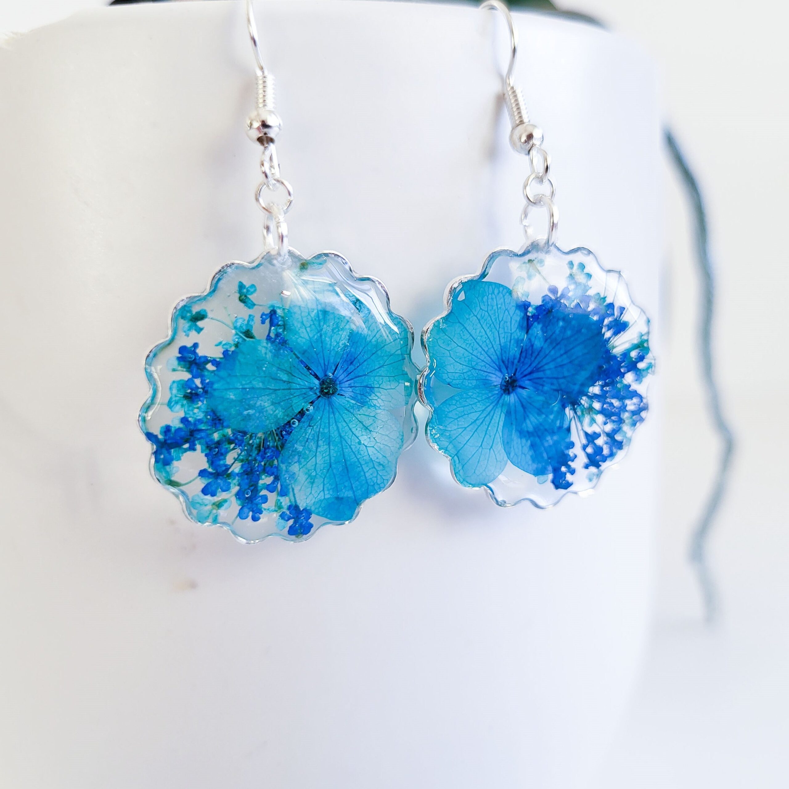 Handmade real pressed flower earrings with blue hydrangeas. Available on gold/silver plated. Earrings measure approximately 1″ with a circular wavy, squiggle rim.