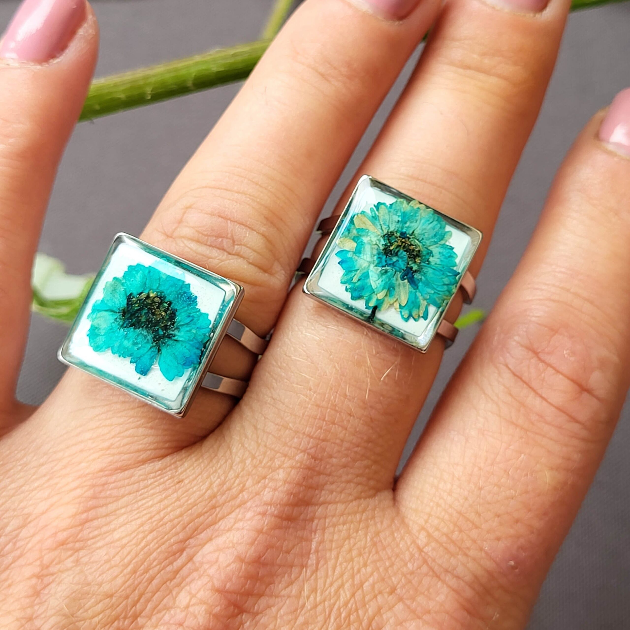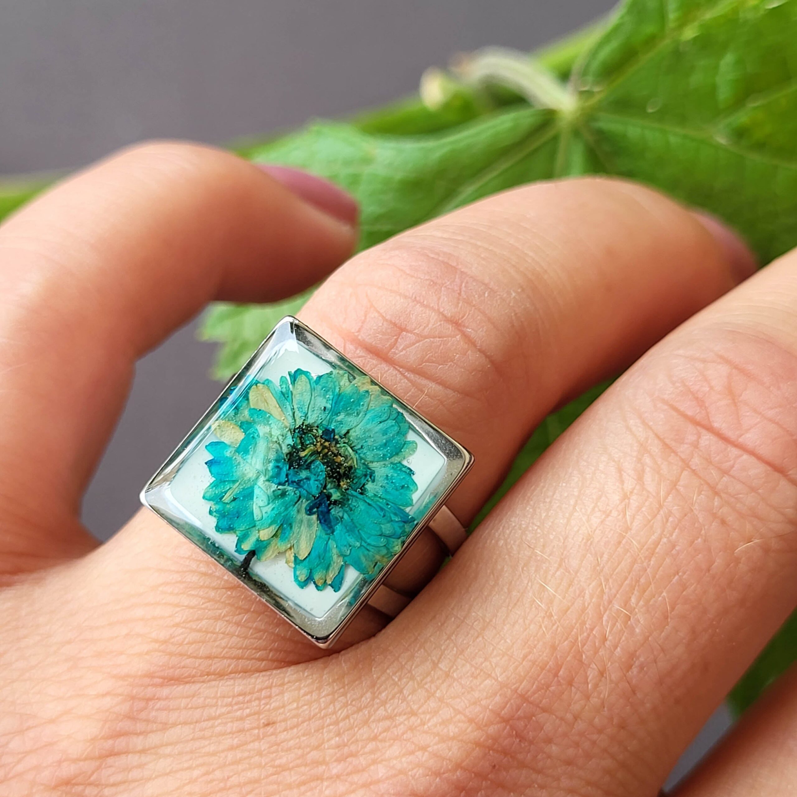 Real flower resin ring, featuring turquoise pressed flower against a white background. The ring measures approximately .5″ x 5″ (12x12mm)
