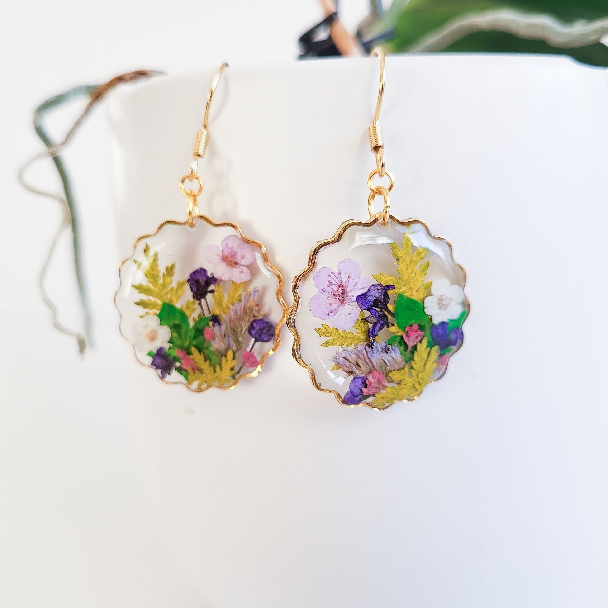 Handmade real pressed wildflower flower earrings. Available on gold/silver plated. Earrings measure approximately 1″ with a circular wavy, squiggle rim.